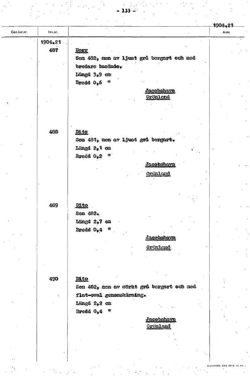 - 133 - 1904..21 1904,21 rjan Com 482 ei av 3.3uGt grå bert ochmed bredare ~er langa 399 exa hredd 0,6 " " :Jacobs Gralland 489 at* som 4e1t men av ljust e te länd 2,1 ca Bredd 0,2 Jaooballeva 2«, länsa 2,7 em Bredd 0 *, 4 oolotte, G~and 490 att Sota 482, -men av nörkt bo? - och ied flat-oval genomakilrning• laned 2,2 ca Bredd 0,4 "' tarva Grönland [ocr]