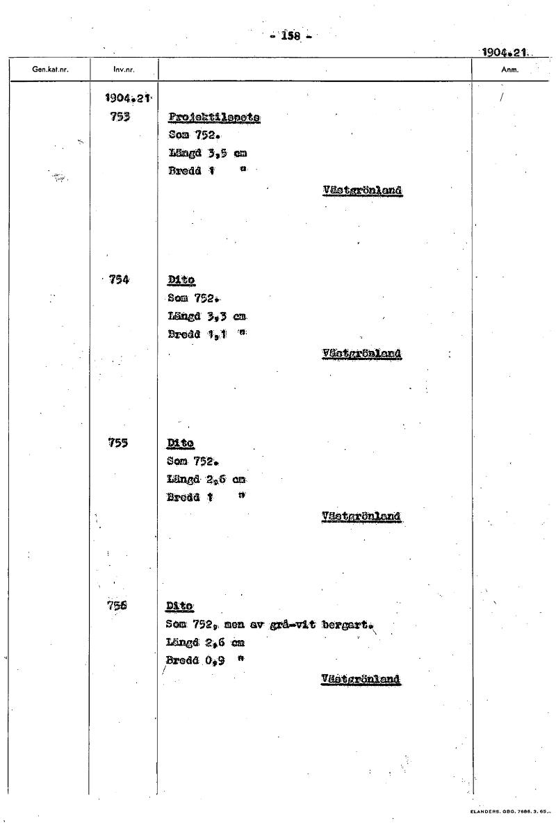 1904,21,, 1904421 753 PiroJektilepete 3«. 752» Langa 5,5 Bredd 1 n Viletort34, • 754 Dito So 752., längd 393 em Bredd 1914 'tt, .yards~gsa 755 Dito som 72,'. längd -296 em Bredd t Vlietfiräninnti 756 ...
