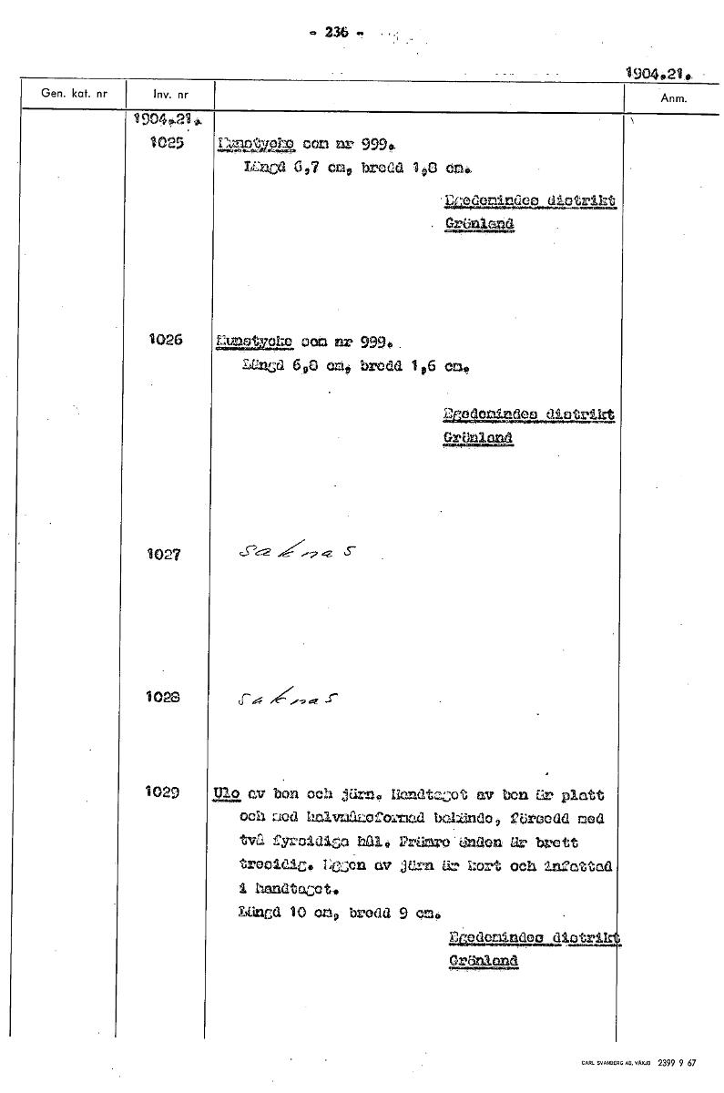 - 236 - 1904021, 1904021 1029' ra..2cty2129 con nr 999, d 697 cm, broed 190 on9, 'orrinclec diat ht Grkinland 1026 nr 9999 LänGd 690 cmty brodd 196 cm9 Grönland 1027 1029 1029 Ulo ev bon och järn9 Unnat—et av hma fir platt och riad 1.1a1vnaLofolmad bakända, 2örcodd med tva fyroldisa talk, Prämrc änden är brott troc1ar9 7;cjen av jern är kort och 1n2attad i han u€ Läncd 10 om9 brodd 9 amp 221221411299.491;ri Grönland [ocr]