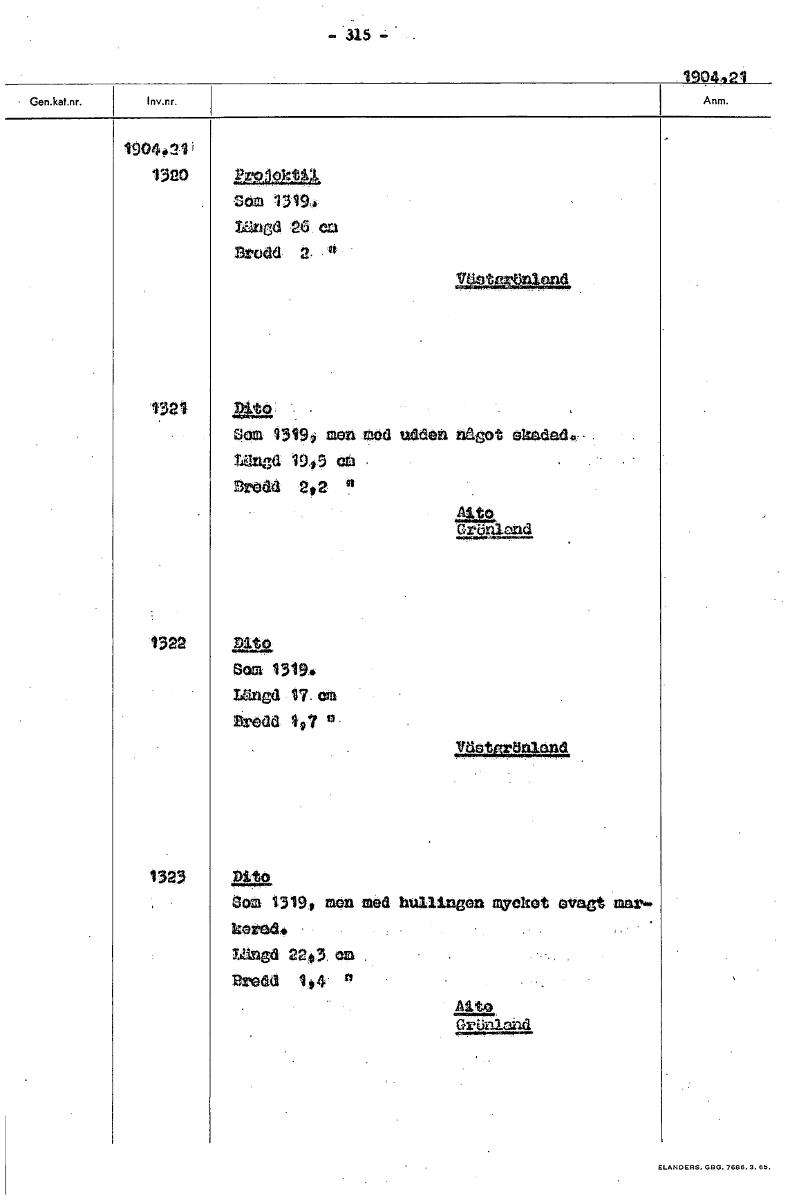 • - 315 - 1904, 2'1 190441i 1320 1321 ». Sem 1319i mon med udden nagot skadad° - Lagd 1945 cm Bredd 2,2 n Ätt Ickaand 1322 åtg. Som 13194 Längd 17. em Bredd 1#7 VaettnitIniond 1323 Som 1319, men med hul... Visa hela