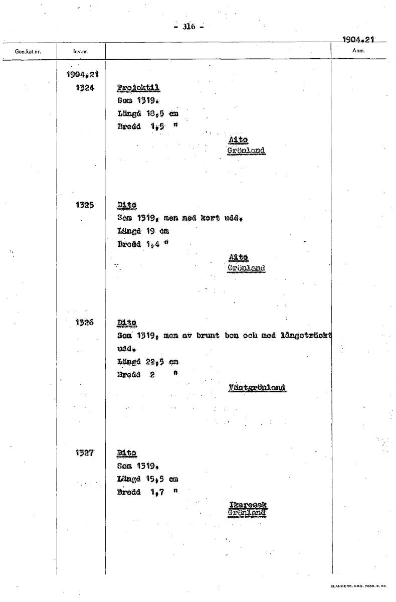 • - 316 - 1904.21 190441 1324 Zrga~, Som 1319 ägd 1805 öm nroda i p 5 rkkiloncl 1325 Pito. Som 1319, mon mod kott udd• Längd 19 ÖM Brodd 194 n 1326 att om 1 19 mon av brunt bon och mod långstrtiok udd; ... Visa hela