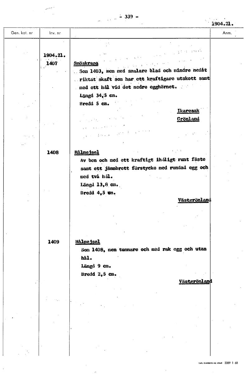 • 1904.21. • 1904.21. 1407 Snöskrapa Sem 1403, men Med smalare blad och mindre nedåt riktåt:åkaftSom har,ett kraftigare utskott samt . med ett hål 'vid 'det nedre egghörnet. Längd 34,5 cm. Bredd 5 cm. Ikaresak Grönland 1408 HAlme sel Av ben och med ett kraftigt ihåligt: runt fäste samt ett jämnbrett förstycke med rundad egg och med två hål. Längd 13.8.cm., teredd 4,5 m. Västgrönlan' 1409 B►lmeisel, Som 1408, men tunnare och med rak egg och utan hål. Längd 9 cm. Bredd 2,5 cm. Väst rönl [ocr]