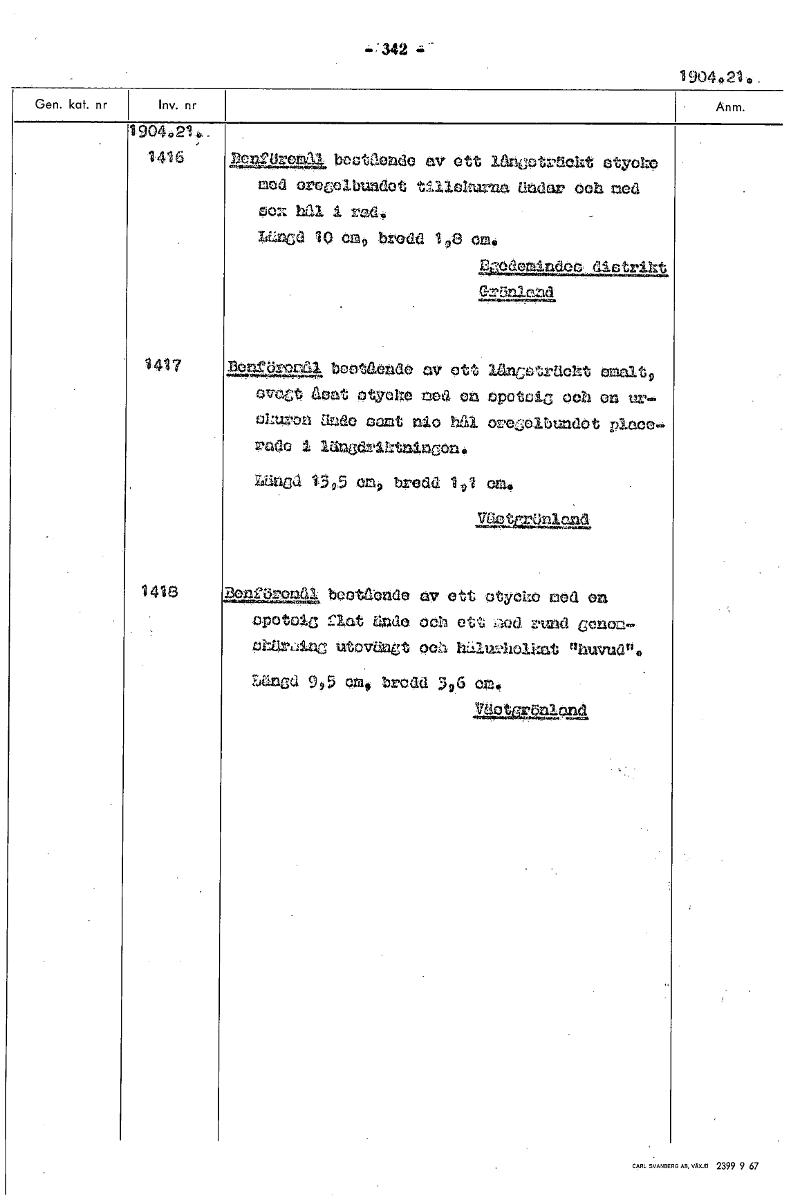 --342 41- 19O4.21 1904,2%. 1416 bestaendo av ott långstrUckt °tycke- med oregclbundot tillskurna ändar och med son hal 1 rsd9 Ungd 10 cmp bQ& 190 cm. redemindes distrikt GrUnIcnd 1417 Ben2öronäl boend...Visa hela