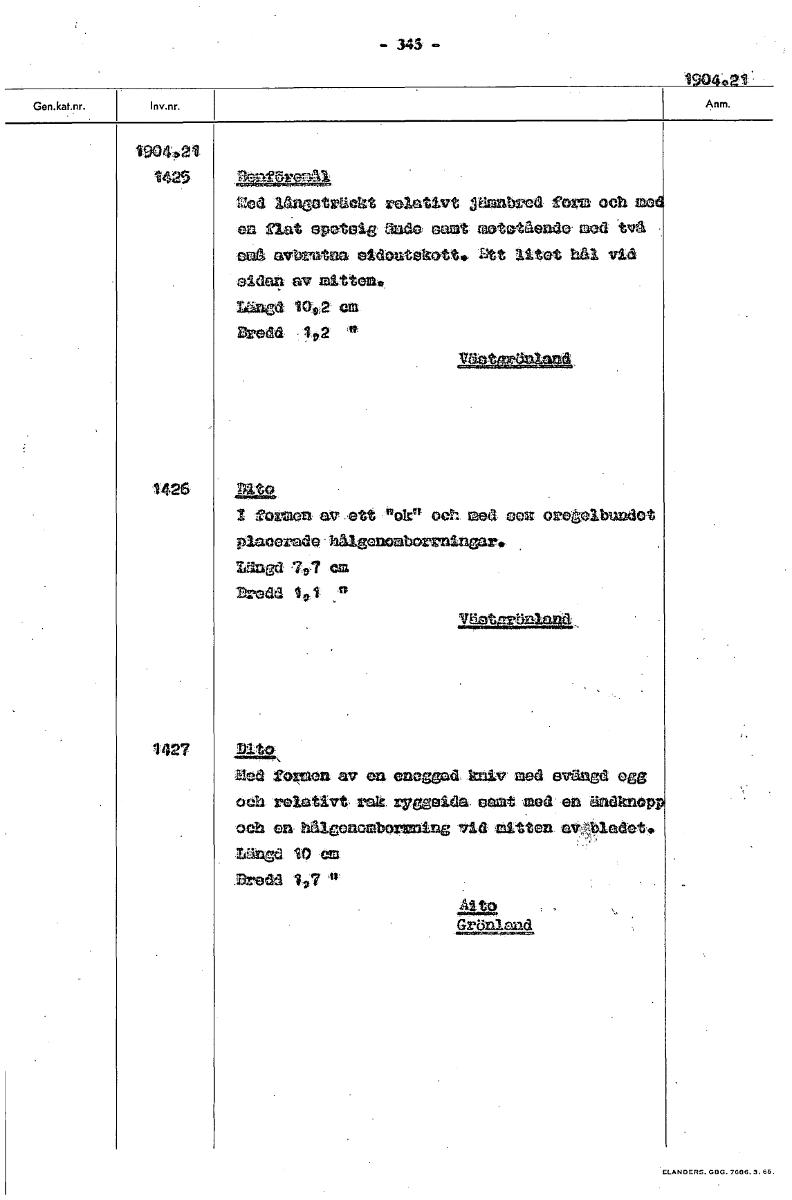 - 343 - 1904021' 1904.;?21 1425 122-9rusgya kbed längsträckt relativt jämnbred form och me en flat spetsig ände samt motstående mod två sed avbrutna sidoutekott, ztt litet hell vid elden av mitten** rUagd 10,2 cm Bredd 1,2 'n' Väs 1426 1 formen av ett "ok" och med sex ooe1budot placerade-hälgenomborrningar 'längd 77 cm Lehedd lel .11 VästArzgnlaki 1427 Dito, Med formen av en eneggad kniv med evängd egg och relativt rak. ryggsida earl med era ~knop och en hälgenemborrning vid -mitten av-bladet. längd 10 cm Bredd " 31/2 Grönland [ocr]Stäng