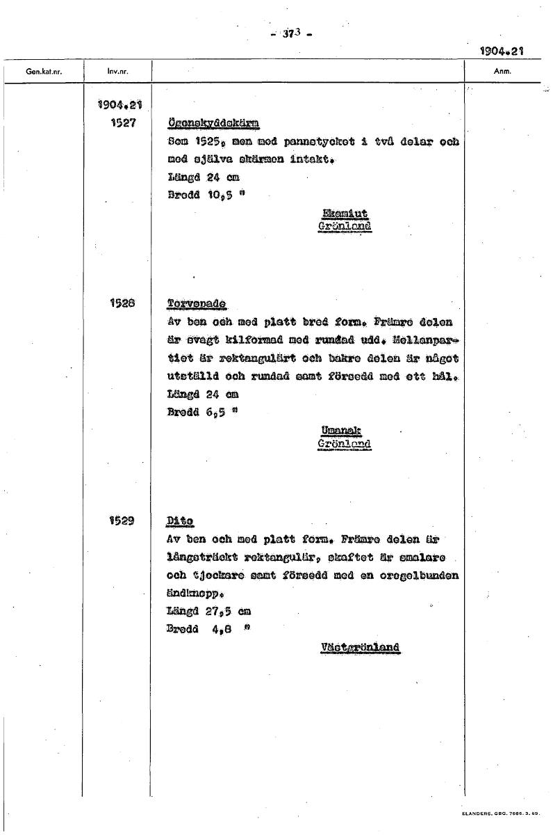 1904.21 1904..21 1.5.27 Ogoneltvddekärm eom 1525 men med pannetyeke vä doinr Och gned ejä3.va ekärmen intakt. längd 24 em Brodd 1095 !knut, !knut,Grönland 1528 Torvecade Mr ben och med platt bred form...Visa hela