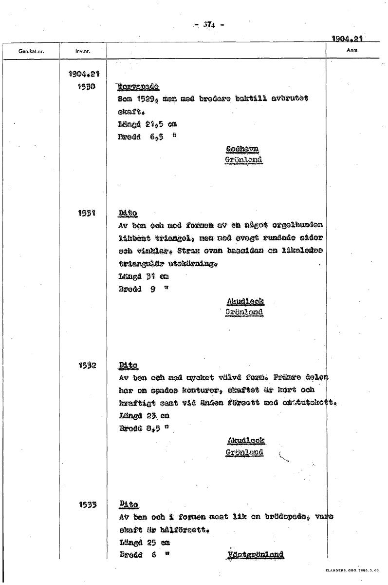 374 - 1904.21 4.21 1330 4m.mwww21 Som 15290 men e baktill avbrutet ekaft. lånad 2105 cm Bredd 605 0 Godhavn GrUniand 1931 ata Av ben •oeh mod forten av något orgelbundon likbent triangolp ram ned avogt rundade sidor och vinklmrö Strax ovan h000ldan en likalogoe triangulär utokärninec, Längd 51 cm Brodd 9 cod 1932 »19, Av bon och med gyeket vdlvd form. Premre delo har on apades konturero okaftot är kort och kraftigt oant vid änden törett med eltr4tuteko tt. Långd 23. ca Bredd SO Akudlgek 13 2114 Åt ben och $ formen mest lik on brödepodep okaft är hålföreett. langa 25 am Bredd 6 .0910.1~1 [ocr]Stäng