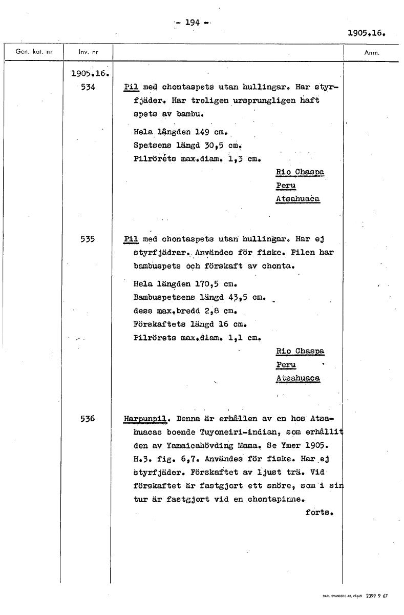 - 194 1905.16. 1905•46. 534 Pil med chontaspets utan hullingar. Har styr- fjäder. Har troligen ursprungligen haft spets av bambu. Hela längden 149 cm.. Spetsens längd 30,5 cm. Pilrörets Max.diam. 1,3 cm. Rio Chaspa Peru Atsahuaöa 535 Pil med chontaspets utan hullingar. Har ej styrfjädrar. Användes för fiske. Pilen har bambuspets och förskaft av chonta. Hela längden 170,5 cm. Bambuspetsens längd 43,5 cm. dess max.bredd 2,8 cm. Förskaftets längd 16 cm. Pilrörets max.dlam. 1,1 cm. Rio Chaspa Peru Atsahuaca 536 Harpunpil. Denna är erhållen av en hos Atsa- huacas boende Tuyoneiri-indian, som erhålli den av Yamaicahövding Matua. Se Ymer 1905. H.3. fig. 6,7. Användes för fiske. Har ej styrfjäder. Förskaftet av ljust trä. Vid förskaftet är fastgjort ett snöre, som i si tur är fastgjort vid en chontapinne. forts. [ocr]