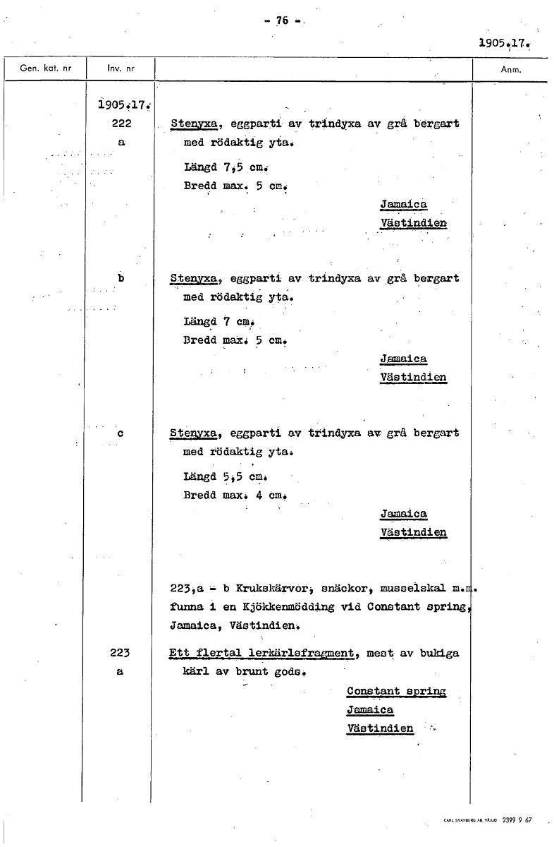 -76.. 1905.37: l905:17: 222 Stenyxa, eggparti av trindyxa av grå bergart a med rödaktig yta: Längd 745 cm: Bredd max: 5 cm: Jamaica Västindien Stenyxa, eggparti av trindyxa av grå bergart med rödaktig yta. Längd 7 Bredd mak. 5 cm. Jamaica Västindien c Stenyxa, eggparti av trindyxa av grå bergart med rödaktig yta: Längd 5,5 cm. Bredd max. 4 cm. Jamaica Västindien 223,a b KrukskärVör4 snäckor, musselskal mön funna i en Kjökkenmödding vid Constant spring, Jamaica, Västindien. 223 Ett flertal lerkärlefragment mest. av bukiga a kärl av brunt gods. Constant_ppring Jamaica Västindien [ocr]