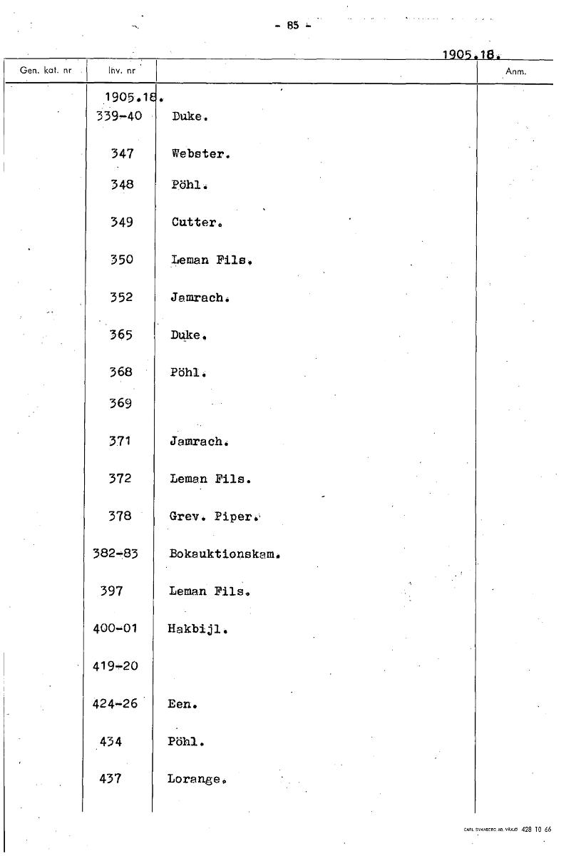 • 1905.18. 1905.1 339-40 Duke. 347 Webster. 348 Pöhi. 349 Cutter. 350 Lervan Fils. 352 Jamrach. 365 Duke. 368 Pöhl. 369 3.71 Jamrach. 372 heman Pils. 378 Grev. Piper." 382-83 Bokauktionskam. 397 Lervan ... Visa hela