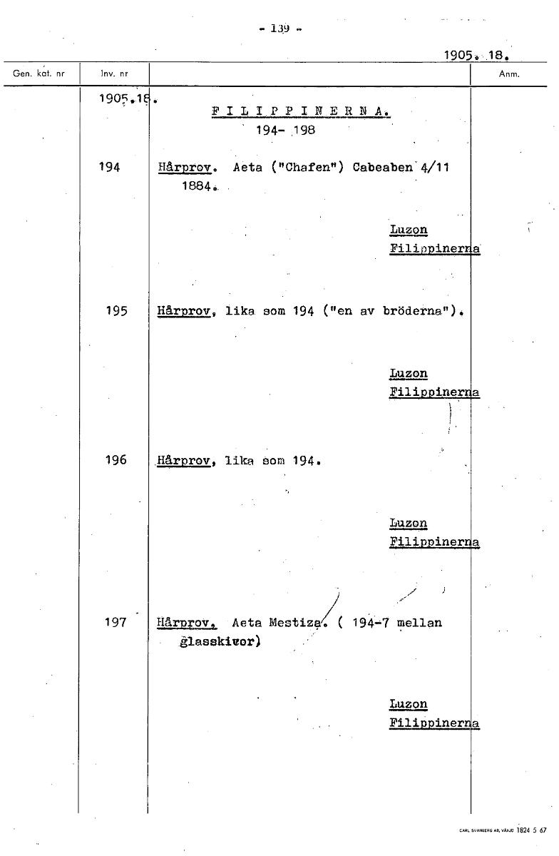 • - 139 1905. 18. 1905, ILI,PPINERN At 194- 198 194 Hårprov. Aeta ( "Chafen" ) Cabeaben' 4/11 Luzon P•iner a 195 Hårprov, lika som 194 ("en av bröderna") Luzon Filiiiiner a 196 .Hårprov, lika som 194. L... Visa hela