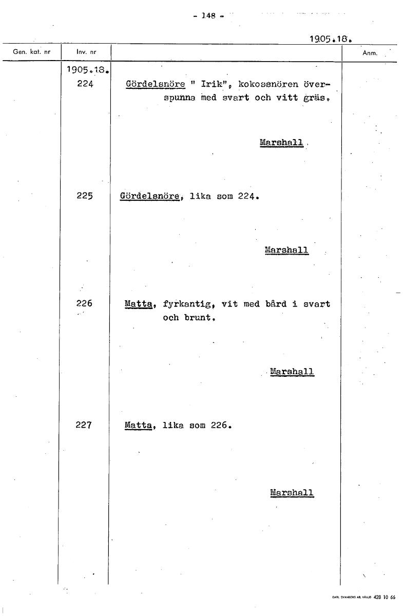 • - 148 19,05:18. 1905.18. 224 Gördelsnöre " kokossnören över- spunna Med svart och vitt träs, Marshall, 225 Gördelsnöre, lika som 224. Marshall 226 Mattall fyrkantig, vit med bård i svart och brunt. Ma... Visa hela