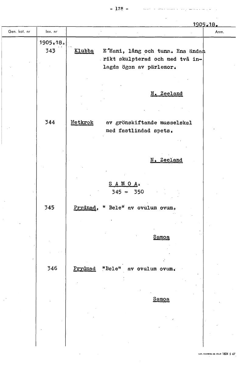 • 1905i18. 1905018. 343 Klubba EIHanip lång och tunn. Ena ända rikt skulpterad och med två in lagda ögon av pärlemor. N. Zeeland 344 Metkrok av grönskiftande musselskal med fastlindad spets, N. Zeeland ... Visa hela