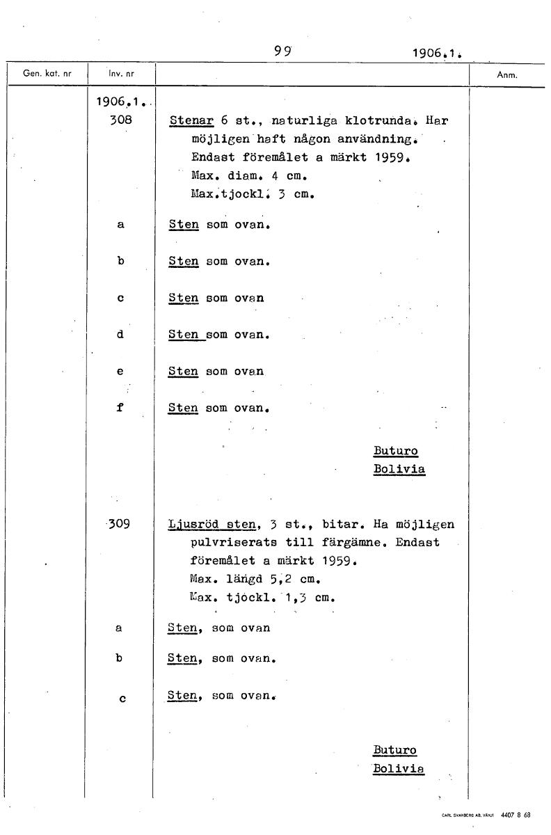 9 9 19061. 1906.1.. 308 Stenar 6 st., naturliga klotrunda. Har möjligen haft någon användning. Endast föremålet a märkt 1959. Max. diam. 4 cm. Max.tjockl. 3 cm. a Sten som ovan. b Sten som ovan. c Sten som ovan d Sten som ovan. e Sten som ovan. Sten som ovan. Buturo Bolivia 309 Ljusröd sten, 3 st., bitar. Ha möjligen pulvriserats till färgämne. Endast föremålet a märkt 1959. Max. lähgd 5,2 cm. Lax. tjockl. 1,3 cm. a Sten, som ovan b Sten, som ovan. c Sten, som ovan. Buturo Bolivia [ocr]