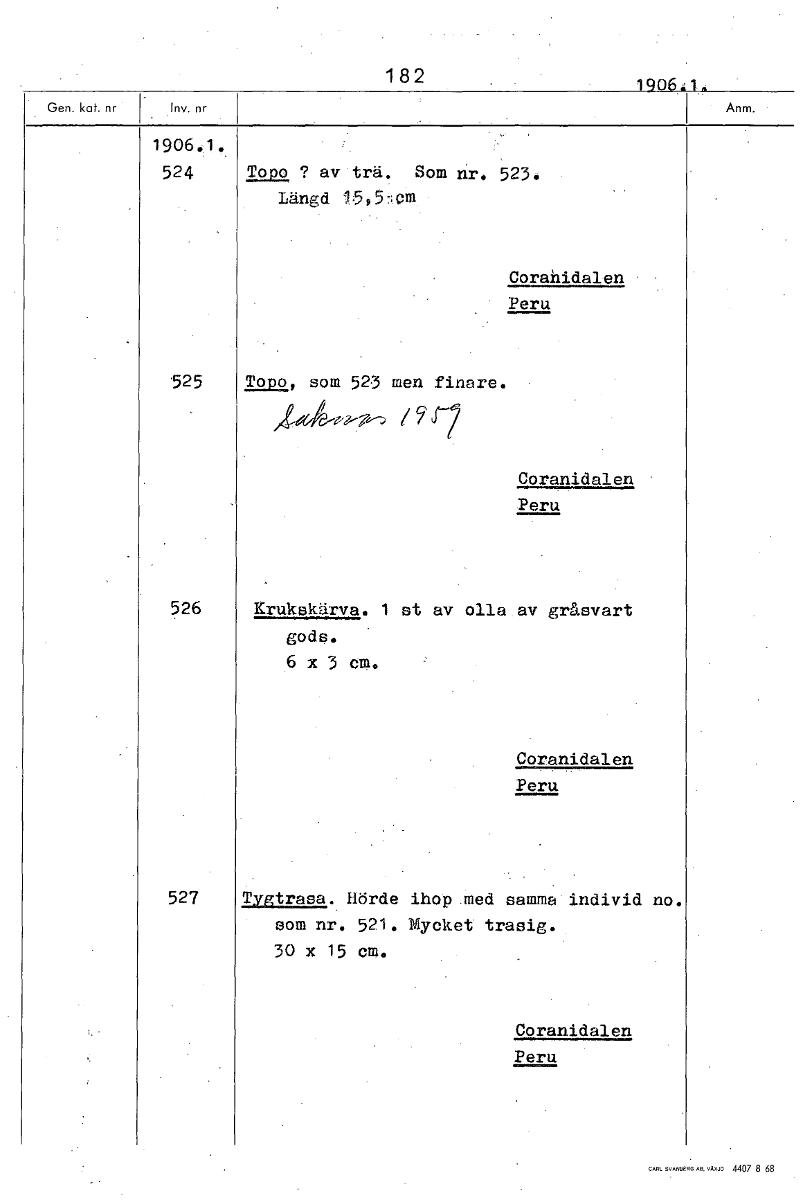 • 182 1906: 1906.1., 524 Topo ? av trä. Som nr. 523. Längd 1595cm Coranidalen • Peru 525 Topo, som 523 men finare. (A4-1~ in7 Coranidalen Peru 526 Krukskärva. 1 st av ollwav gråsvart gods. 6 x 3 cm. Cor... Visa hela