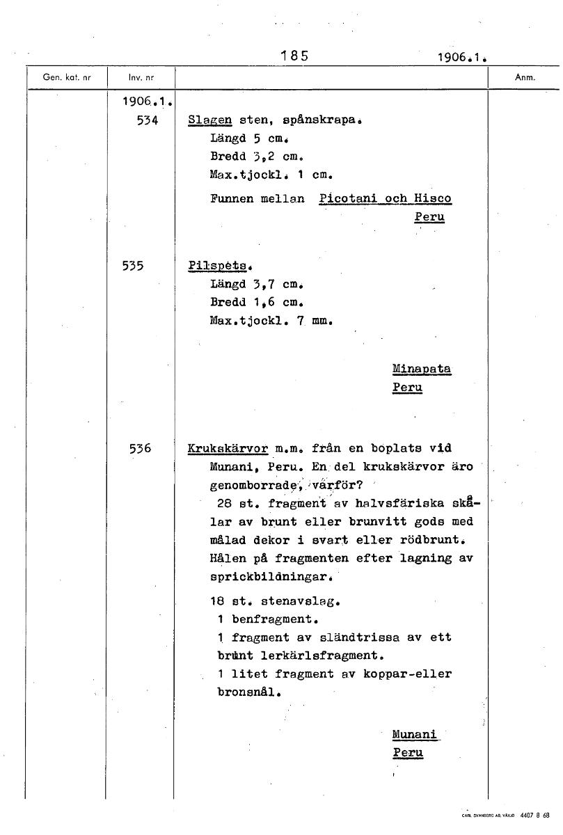 1 8 5 1906.1. 1906.1. 534 Slagen sten, spånskrapa. Längd 5 cm. Bredd 3,2 cm. Max.tjockl. 1 cm. Funnen mellan Picotani och Hisco Peru 535 Längd 3,7 cm. Bredd 1,6 cm. Max.tjockl. 7. mm. Minapata Peru 53...