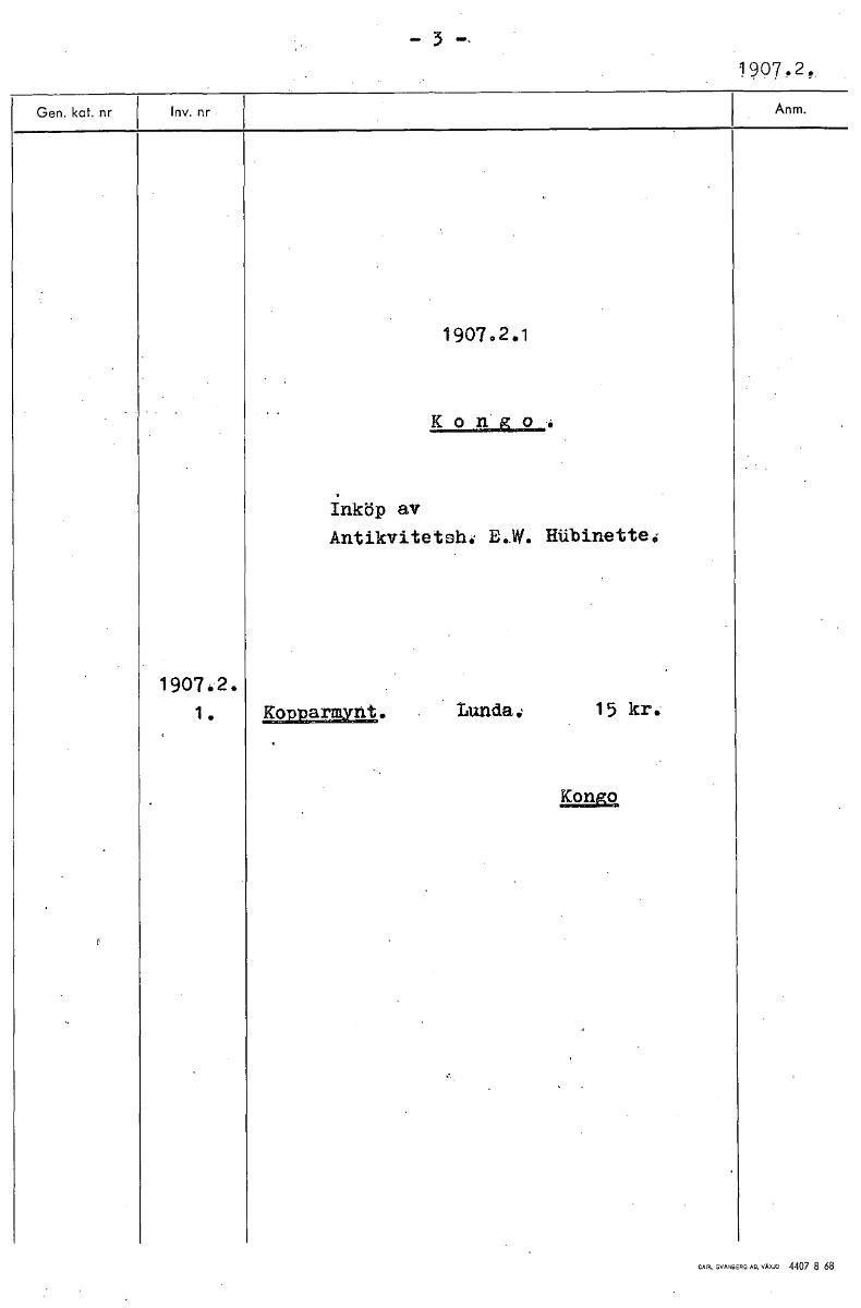 • -3, 1907.2, 1907.2.1 Kongo Inköp av Antikvitetsh: E.W. HUbinette. 1907.2. 1. Kopparmynt. Lunda, 15 kr. Kongo [ocr]