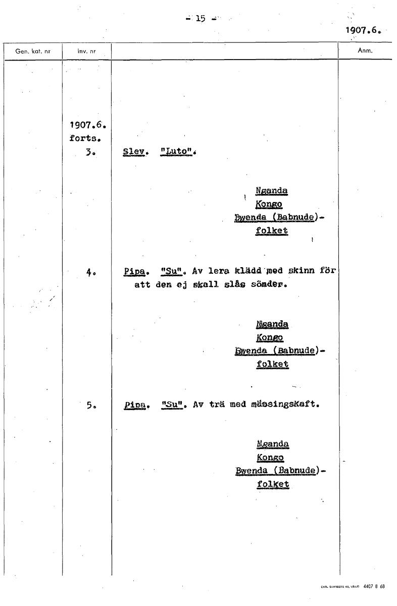 • -;» 15 1907.6. 1907.6. forts. 3 2215 "Luto". 12~. Kongo Bwenda (Babnude)- folket Ria. nu". Av lera klädd tued skinn för att den ej skall slås sönder. figoldg, jonlo 15Wenda (Babnude)- folket ana. osui... Visa hela
