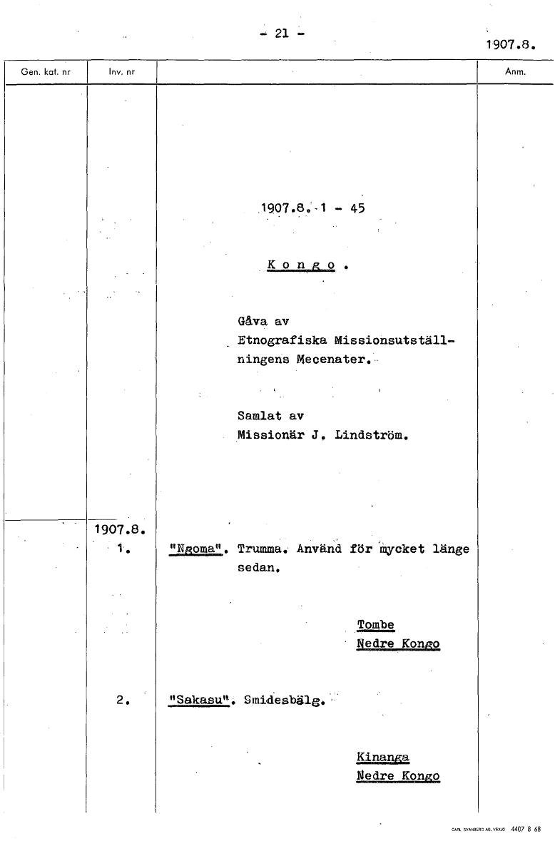 • -21- 1907.8. 1907.K-1 - 45 Kongo Gåva av Etnografiska Missionsutställ- ningens Mecenater. Samlat av Missionär J. Lindström. 1907.8. 1' goma",. Trumma4 Använd för mycket länge sedan. Tombe Nedre Kongo ... Visa hela