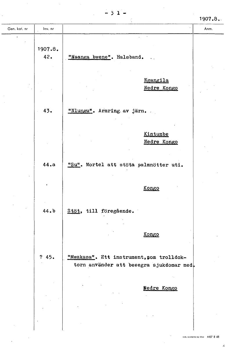 - 3 1 - 1907.8., 1907.8. 42. "Nsanga bwene". Halsband. Ngangila Nedre Kongo 43. "Nlungu",. Armring: av järn. Kintumbe Nedre Kongo 44.a "Su". Mortel att stöta palmnötter uti. Kongo, 44 . b Stöt, till föregående. Kongo ? 45. "Mwakasa". Ett instrument,om trolldok- torn använder att besegra sjukdömar med hiedre Kongo [ocr]