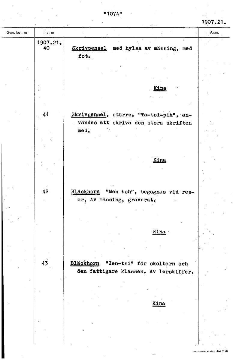 • "107A" 19074 1907.21-, 40 Skrivpensel med hylsa av mässing, med fot. Kina 41 Skrivpensel, större, Ta-tsiT..pih",•an- vändes att skriva den stora skriften med. Kina 42 Bläckhorn "Meh hoh", begagnas vid... Visa hela