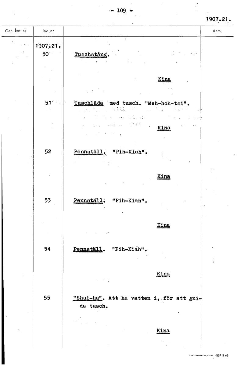 • - 109 1997.2 1'90741.. 50 "Tuschstång. Kina 51' Tuschlåda med tusch. "Meh-hoh-ts1". Kina 52 Pennställ. "Pih-Kiah". Kina 53 Pennställ. "Pih-Kiah". Kina 54 Pennställ. "Pih-Kiåh". Kina 55 "Shui-hu". Att ... Visa hela
