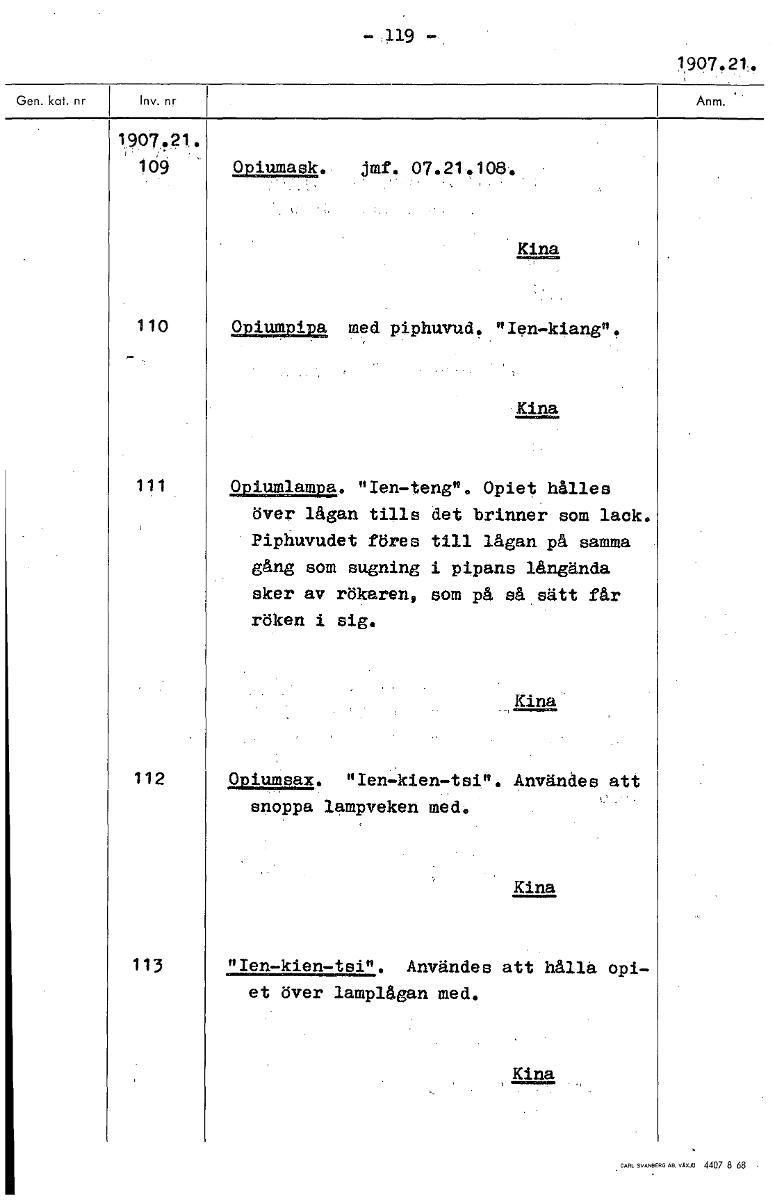 • :119 1,907.21:. 1907.21. 1907.21.1Ö9 Opiumask.. jmf. Kina 110 Opiumpipa med piphuvud. "Ien-kiang". Kina Opiumlampa. "Ien-teng". Opiet hålles över lågan tills det brinner som lack. Piphuvudet föres til... Visa hela