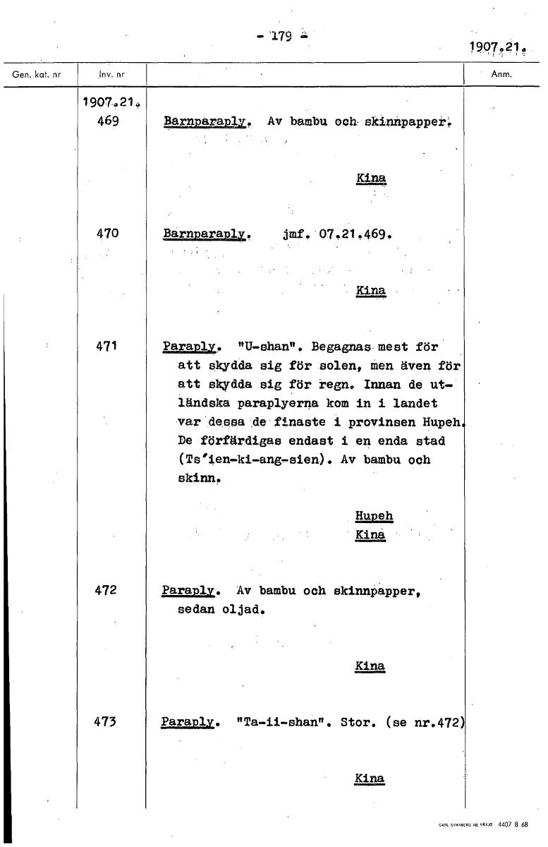 - 179 1907,.2'1, 1907.21. 469 .....2wrailzEtsa. Av bambu och- skinnpapper', Kina 470 Barnparaply. jmf. 07.21,469. Kina 471 Paraply. "U-shan". Begagnas-mest för att skydda sig för solen, men även för a...