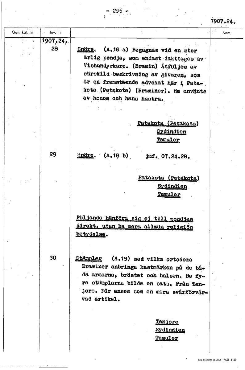 1907.24. 1907.24y 28 2229 (4.18 a) ,Begagnas vid en otor ärlig pondja9 som endast iakttagas av Viehundyrkare.. (Bramin) Åtföljes av särskild beskrivning av givaren, san är en framstående advokat här 4 Pata. kota (Pgtakota) (Braminer). Ha anvante av honom och hans hustru., Pqt kota (Petakota) Svdkndien Tuler 29 Snöre. (4.ip b), jmf. 07 24.28.. Datakota (Petakota) §Ydindien Tamuler Pöl landa hänföra sig eJ till oondiae direkt, utan ha mera allmän reliRlön betydelse. 30 Stämclar (A.19) med vilka ortodoxa Braminer anbringa kastmärken på de bä- da armarna, bröstet och halsen. Be gy. ra etämplarna bilda en sats. Frän Tan- 'jore. Får anses som en mera evårförvär- vad artikel. Taniore Sydindier Tamuler [ocr]Stäng