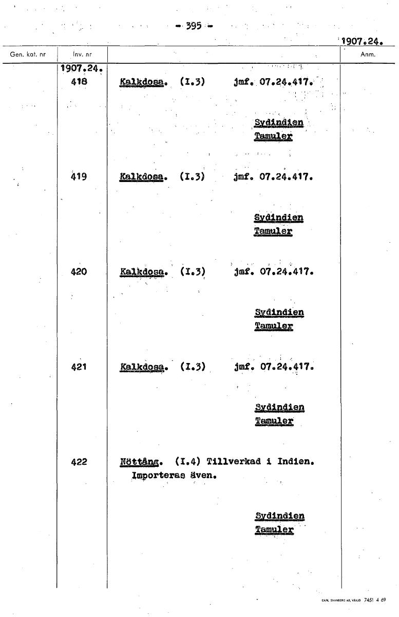 • - 395 - 1907.24. 1907..24. 418 mosa. (1.3) jmf 07.24.417 sydindian Tamuler 419 galkdoea. (I.3) jmf. 07.24.417. Svdindien Tamuler 420 Kalkdosa. 1.3) jmf. 07.24.417. Sydålndien Tamuler 421 Kalkdosa. (1.... Visa hela