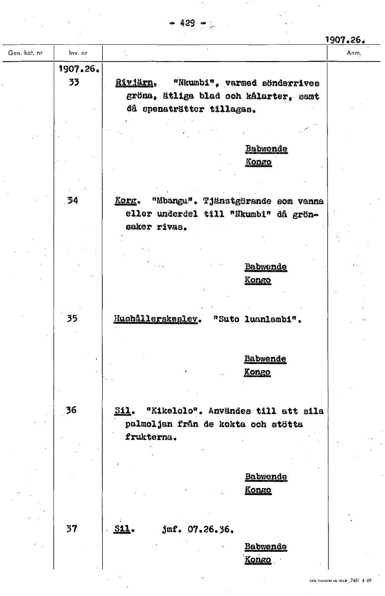 • = 429 - 1907026. 1907.26. 33 flärjänt "Nkumbi"9 varmed sönderrives gröna, ätliga blad och kålartere samt då spenaträtter tillagas. Babwende Rongo, 54 147£0 "Mbangu". Tjänstgörande som vanna eller unde... Visa hela
