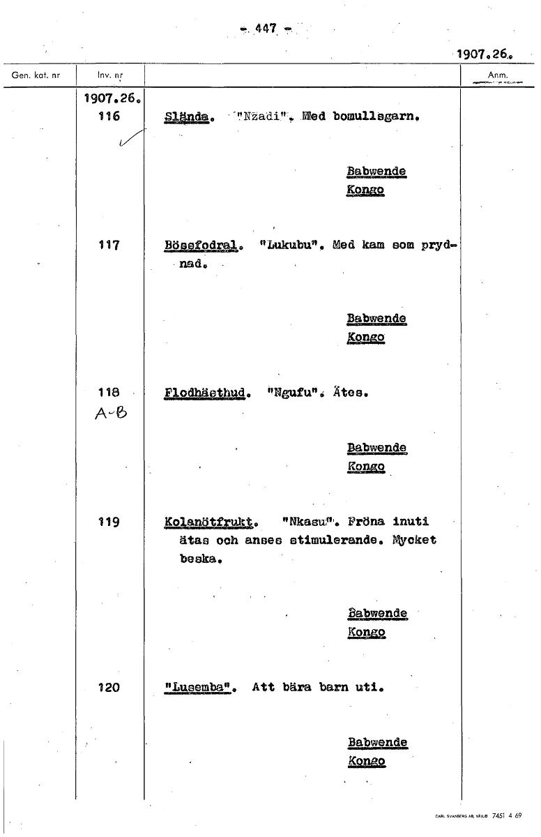 • . 447 ...,.. 1907.26,. 1907.26. 116 Slända. ""readi", ed bomullsgarn. v Babwende Kongo 117 Bäsetodral. niukubun. Med kam som pryd. Babwende Xongo Flodhästhud. "Ngufu". hes. Babwende gc..2aria 119 Kola... Visa hela
