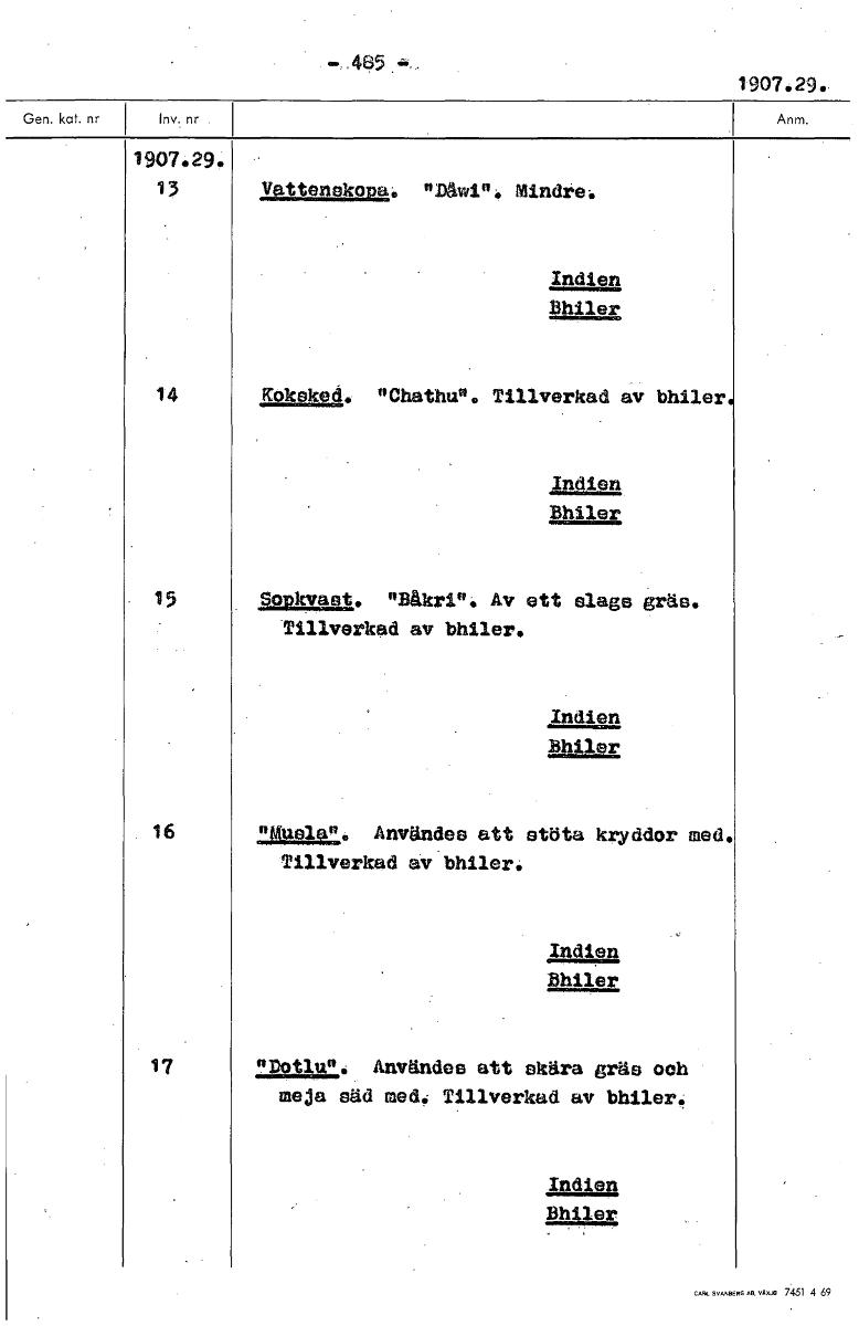 • -_485 4 1907.29. 1907 29. 13 Vattenskopa. "Däwi". Mindre. Indien Bhiler 14 Koksked. nhatha". Tillverkad av bhiler Indien Bhiler 15 Sopkvast. "Bäkri". AV ett slags gräs. Tillverkad av bhiler. Indien Bh... Visa hela