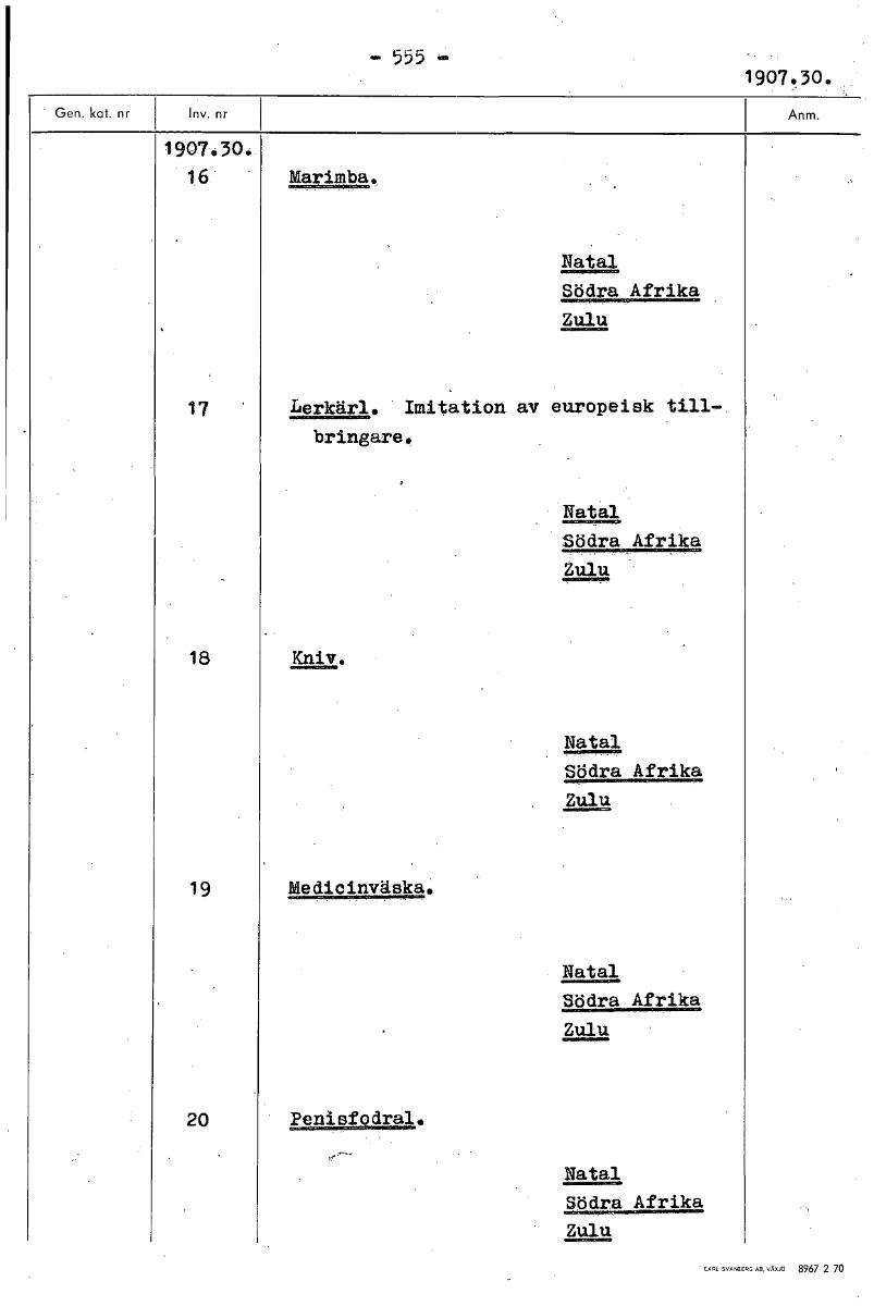 • 555 1907.30. 1907.30. 16 Marimba. Natal Södra Afrika Zulu 17 Lerkärl. Imitation av europeisk till- bringare. Natal Södra Afrika Zulu 18 Kniv. Natal Södra Afrika Zulu 19 Medicinväska. Natal Södra Afrik... Visa hela