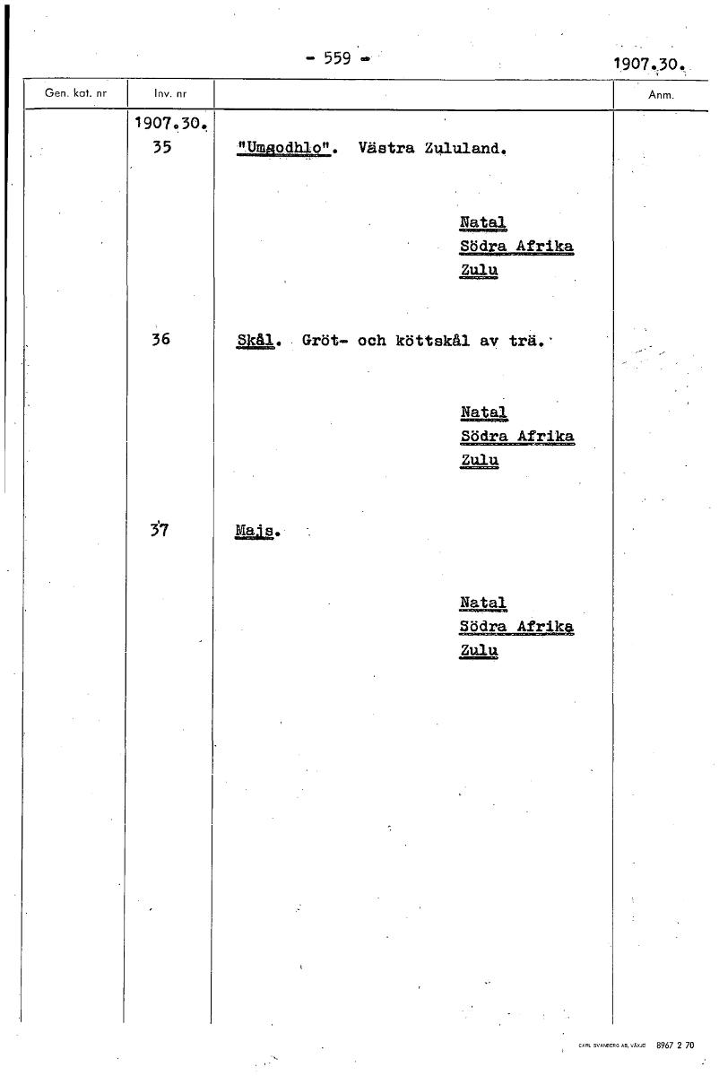 • - 559 1907.30., 1907.30. 35 ntRodhIo". Västra Zululand. Natal Södra Afrika Zulu 36 å. Gröt- och köttskål av trä.' Natal Södra Afrika Zulu 3'7 Mals. Natal Södra Afrika Zulu [ocr]