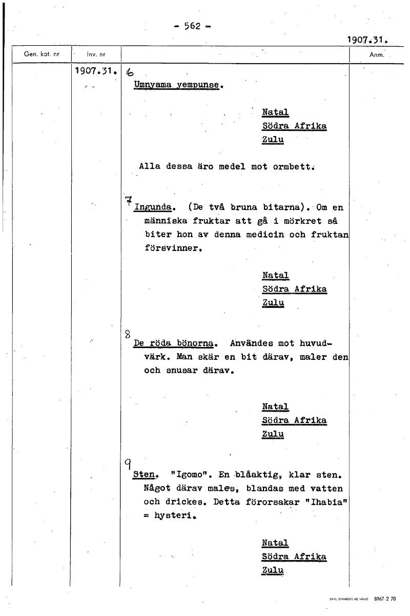 - 562 - 1907.31.. 1907:31_. Utnyama_yempunse. Natal Södra Afrika Zulu Alla dessa äro medel mot ormbett. -4Ingunda. (De två bruna bitarna). Om en . människa fruktar att gå i mörkret så biter hon av denna medicin och fruktan föråvinner. Natal Södra Afrika Zulu 2 De röda bönorna. Användes mot huvud- värk. Man skär en bit därav, maler den och snusar därav. Natal Södra Afrika Zulu 9 Sten. "Igomo". En blåaktig, klar sten. Något därav males, blandas med vatten och drickes. Detta förorsakar "Ihabia" = hysteri. Natal Södra Afrika Zulu [ocr]Stäng