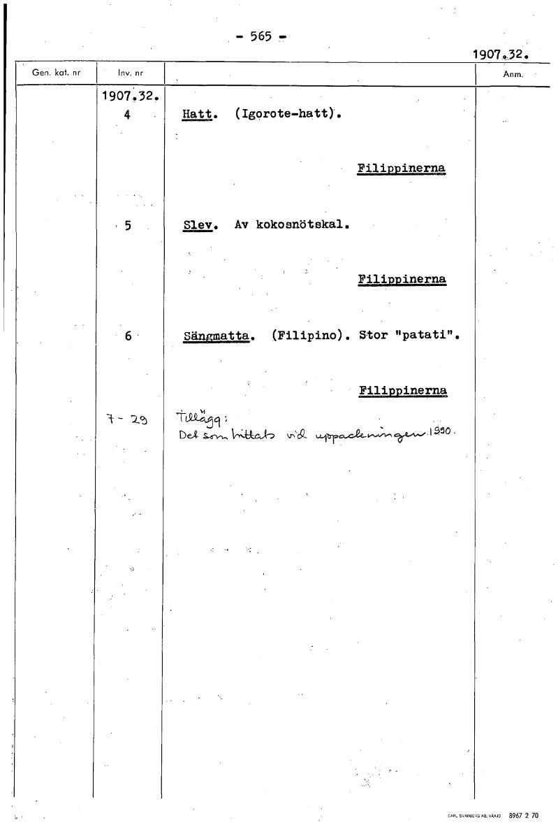 • -565- 1907..324 1907.32.. 4 • Hatt. (Igorote,hatt). • Filippinerna • , . • 5 Slev. Av kokosnötekal. Filippinerna 6 Sängmatta. (Filipino). Stor "patati". • Filippinerna 3- tueer2‘59 .,,,,,_, 1,-,jac,k)... Visa hela