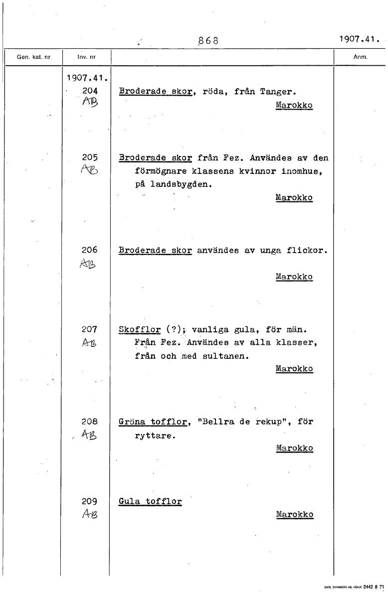868 1907.41. 1907.41. 204 Broderade skor, röda, från Tanger. (533 Marokko 205 Broderade skor från Fez. Användes av den förmögnare klassens kvinnor inomhus, på landsbygden. Marokko 206 Broderade skor användes av unga flickor. A1,2 Marokko 207 Skofflor (?); vanliga gula, för män. Från Fez. Användes av alla klasser, från och med sultanen. Marokko 208 Gröna tofflor, "Bellra de rekup", för ryttare. Marokko 209 Gula tofflor .Marokko [ocr]