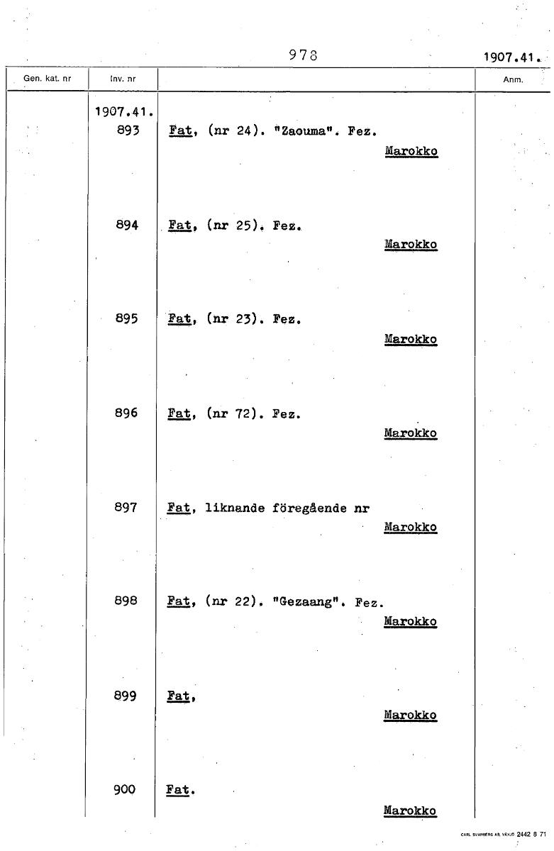 978 1907.41. 1907.41. 893 Fat, (nr 24). "Zaouma . Fez. Marokko 894 Fat, (nr 25). Fez* Marokko 895 (nr 23). Fez. Marokko 896 gm, (nr 72). Fez. Marokko 897 Fat, liknande föregående nr • Marokko 898 Fat, (nr 22) "Gezaang". Fez. Marokko 899 -112.41.* Marokko 900 -112.41.*Fat. Marokko [ocr]