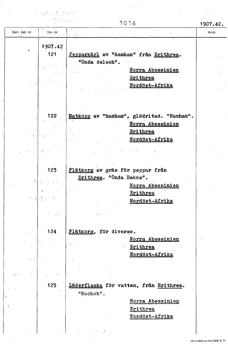 1016 1907.42. 1907.4? 121 Pepparkärl av "hamham" från Erithrea. "Onda delech". Norra Abessinien Erithrea Nordöst-Afrika 122 Matkopp av "hamham", glödritad. "Hamham". Norra Abessinien Erithrea Nordöst-Afrika 123 Flätkorg av gräs för peppar från Erithrea. "Onda Dekos". Norra Abessinien Erithrea Nordöst-Afrika 124 Flätkorg, för diverse. Norra Abessinien Erithrea Nordöst-Afrika 125 Läderflaska för vatten, från Erithrea. "Rochob". Norra Abessinien Erithrea Nordöst-Afrika [ocr]Stäng