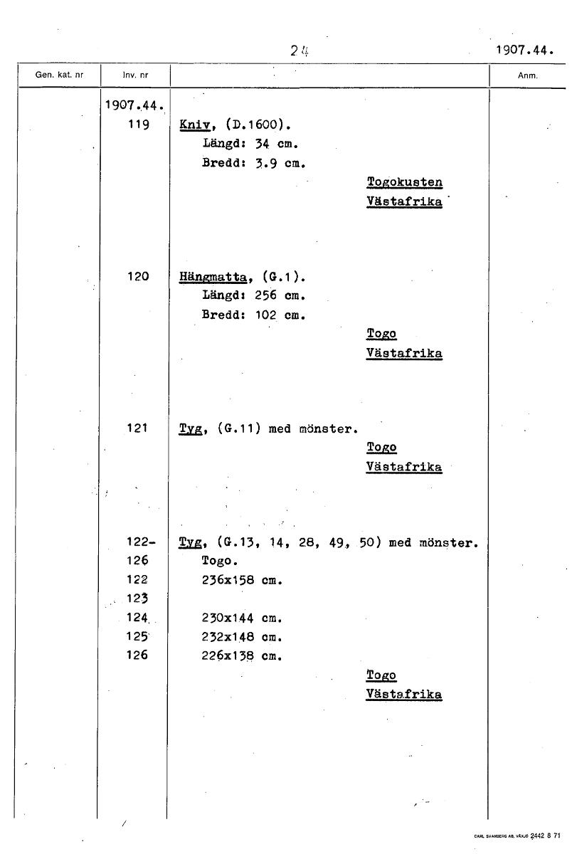 2 1907.44. 1907,44. 119 Kniv, (D.1600). Längd: 34 cm. Bredd: 3.9 cm. Togokusten Västafrika. 120 Hängmatta, (G.1). Längds 256 cm. Bredd: 102 cm. Togo Västafrika 121 Tu, (G.11) med mönster. Togo Västafrika 122- Tag, (G.13, 14, 28, 49, 50) med mönster. 126 Togo. 122 236x158 cm. 123 124, 230x144 cm. 125' 232x148 cm. 126 226x138 cm. Togo Västafrika [ocr]