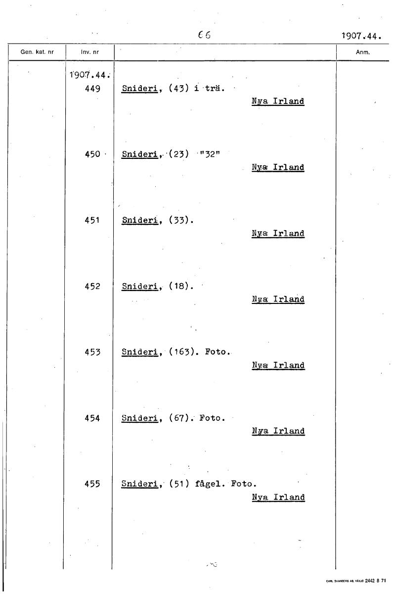 6 1 907 . 44 . 1'907.44: 449 Snideri, (43) trä. Nya Irland 450- Snideri,-.(23) "32" ya Irland 451 Snideri, (33). Nya Irland 452 Snideri, (18). Nay Irland 453 Snideri, (163). Foto.. Nya Irland 454 Snid...