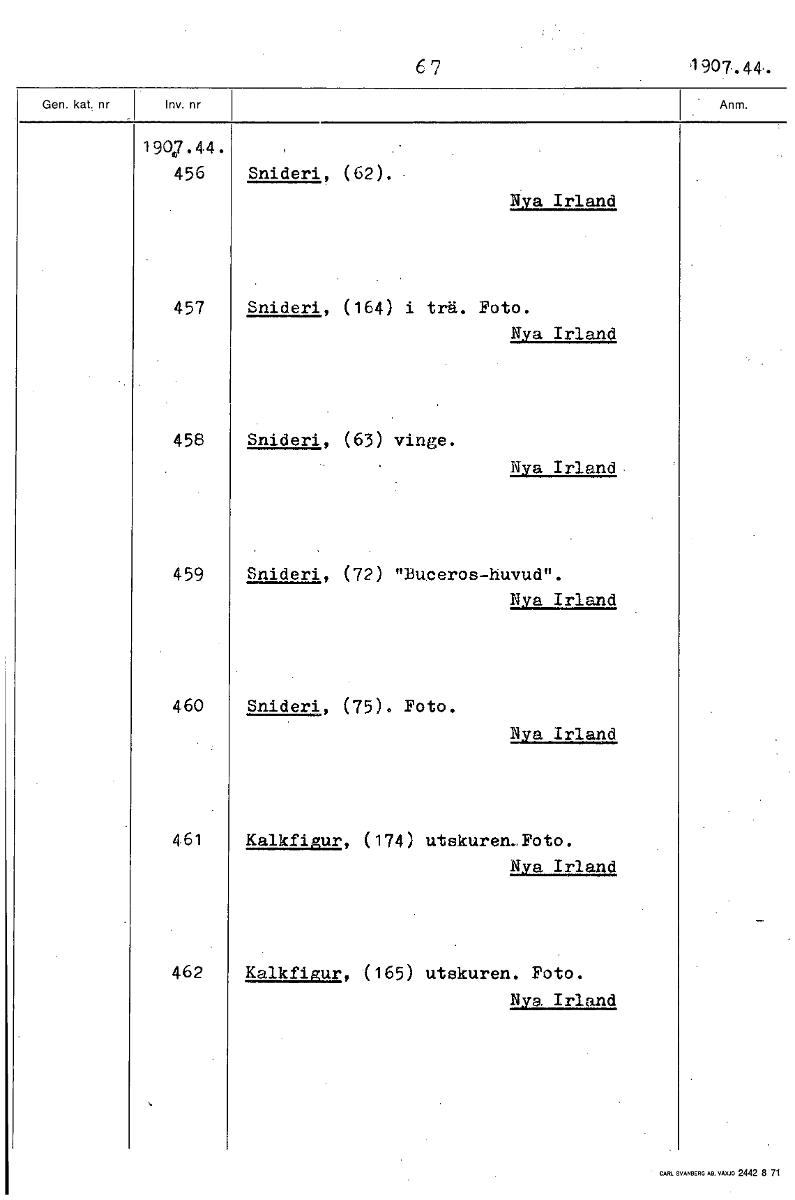• 6 7 1907.. 44.. 1907 .44 456 Snideri, (62). Nya Irland 457 Snideri, (164) i trä. Foto. Nya Irland 458 Snideri,, (63) vinge. Nya Irland. 459 Snideri, (72) "Buceros-huvud". Nya Irland 460 Snideri, (75).... Visa hela