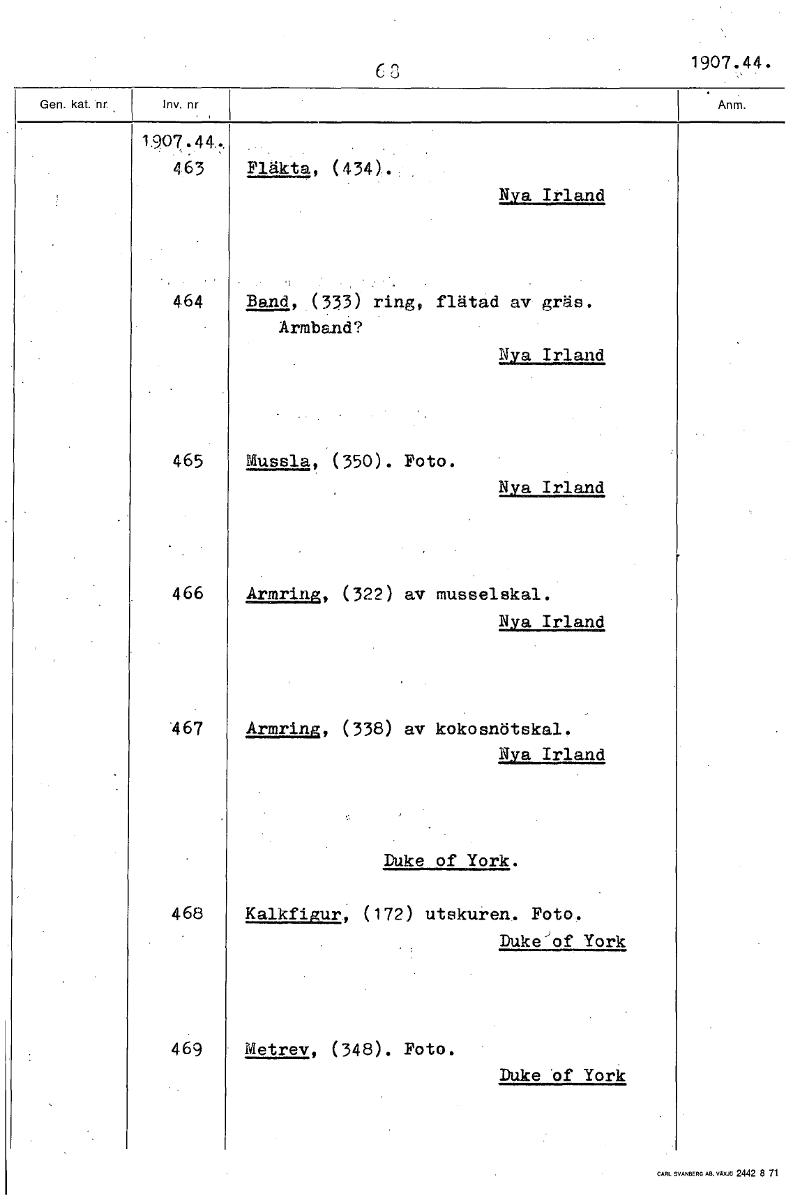 1907.4 1,997.44 463 Fläkta, (434).. Nya Irland 464 Band, (333) ring, flätad av gräs. Armband? Nya Irland 465 Mussla, (350). Foto. Nya Irland 466 Armring, (322) av musselskal. Nya Irland 467 Armring, (...