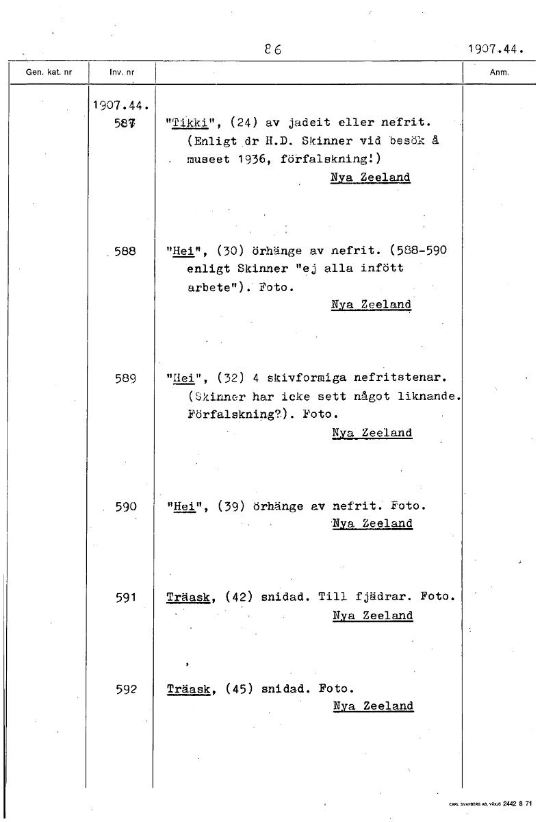 26 1907.44. 1907.44. 587 "Tikki", (24) av jadeit eller nefrit. (Enligt dr H.D. Skinner vid besök å museet 1936, förfalskning!) Nya Zeeland 588 "Hei", (30) örhänge av nefrit. (588-590 enligt Skinner "ej alla infött arbete"). Foto. Nya Zeeland 589 "Hei", (32) 4 skivformiga nefritstenar. (Skinner har icke sett något liknande. Förfalskning?). Foto. Nya Zeeland 590 "Hei", (39) örhänge av nefrit. Foto. Nya Zeeland 591 Träask, (42) snidad. Till fjädrar. Foto. Nya Zeeland 592 Träask, (45) snidad. Foto. Nya Zeeland [ocr]