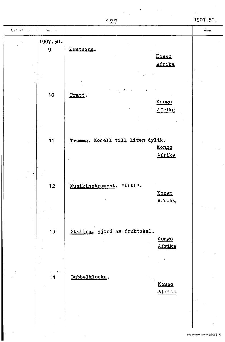 • 127 1907.50. 1907.50. 9 Kruthorn. Kongo Afrika 10 Tratt. Kongo Afrika 11 Trumma. Modell till liten dylik. Kongo Afrika 12 Musikinstrument. niti". Kongo Afrika 13 Skallra, gjord av fruktskal. 14913g9._... Visa hela