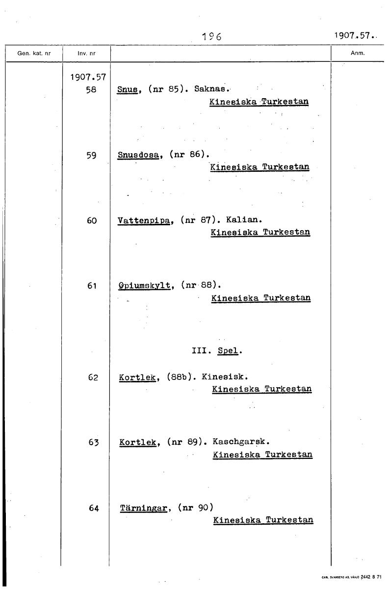 1 9 6 1 907 . 57 1907.57 58 Snus, (nr 85). Saknas.• Kinesiska Turkestan 59 Snusdosa, (nr 86). Kinesiska Turkestan 60 Vattenpipa, (nr 87). Kaldan. Kinesiska Turkestan 61 QPiumskylt, (nr'88). Kinesiska Turkestan III. Spel. 62 Kortlek, (88b). Kinesisk. Kinesiska Turkestan 63 Kortlek, (nr 89). Kaschgarsk. Kinesiska Turkestan 64 Tärningar, (nr 90) Kinesiska Turkestan [ocr]