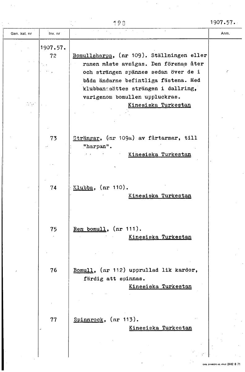 0 2 1907.57.. 1907.57. 72 Bomullsharpa, (nr 109). Ställningen eller ramen måste avsågas. Den förenas åter och strängen spännes sedan över de i båda ändarne befintliga fästena. Med klubban-sättes strän...