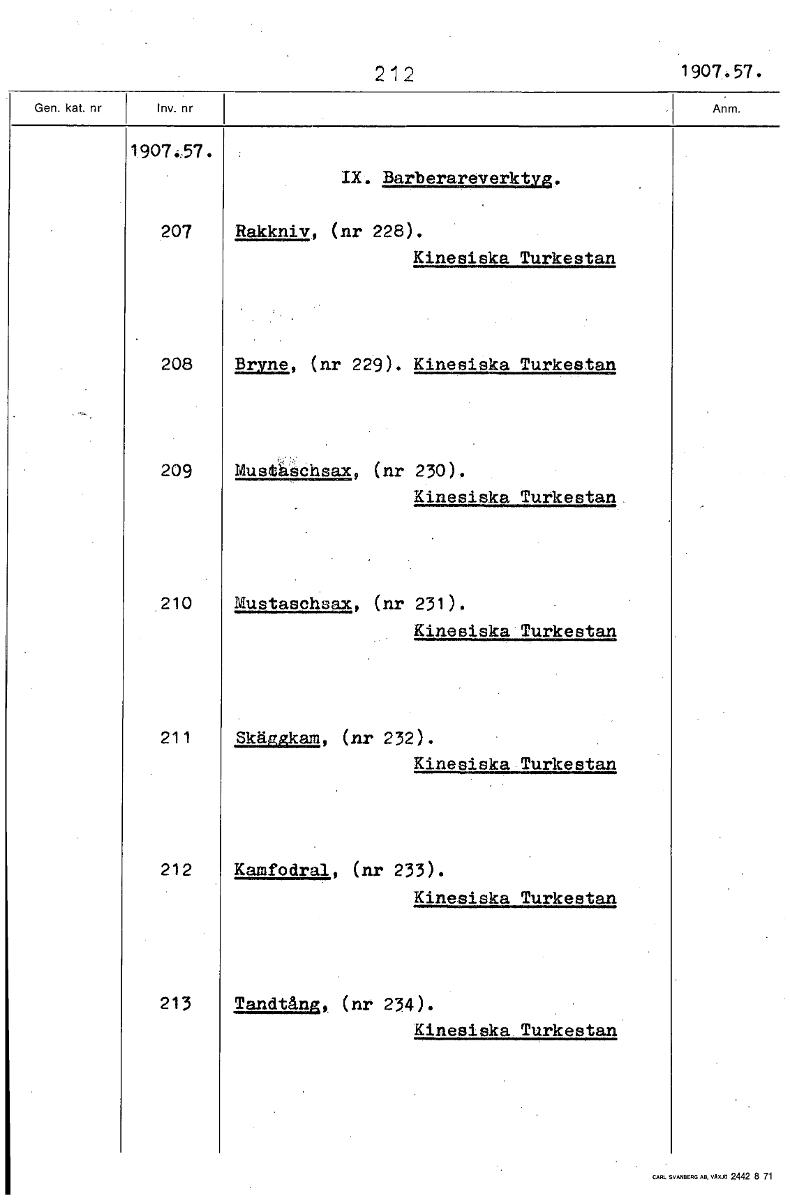 212 1907,57. 1907457. IX. Barberareverktyg. 207 Rakkniv, (nr 228). Kinesiska Turkestan 208 Bryne, (nr 229). Kinesiska Turkestan 209 Musthschsax, (nr 230). Kinesiska Turkestan 210 Mustaschsax, (nr 231)...