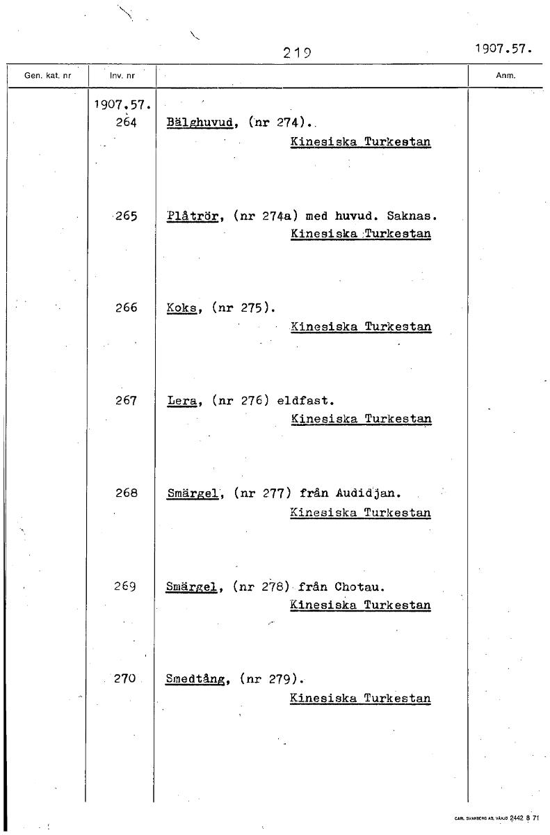 219 1907.57. 1907.57. 264 Bälghuvud, (nr 274). Kinesiska Turkestan 265 Plåtrör, (nr 274a) med huvud. Saknas. Kinesiska:Turkestan 266 Koks, (nr 275). Kinesiska Turkestan 267 Lera, (nr 276) eldfast. Kin...