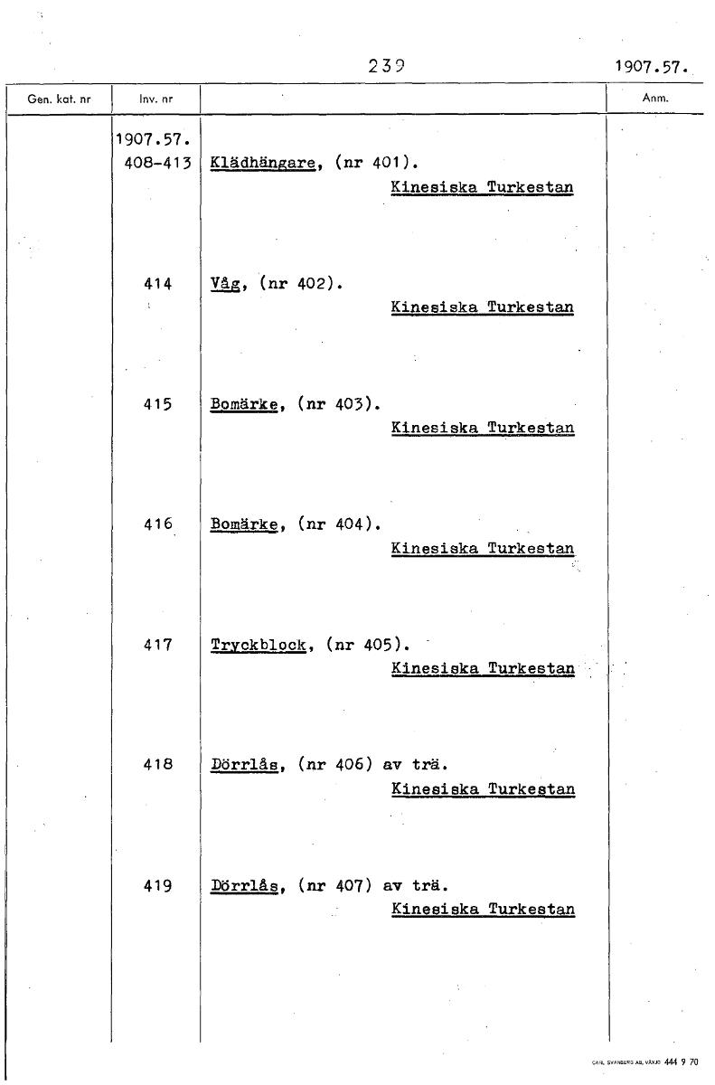239 1907.57. 1907.57. 408-413 Klädhängare, (nr 401). Kinesiska Turkestan 414 Väg, (nr 402). Kinesiska Turkestan 415 Bomärke, (nr 403). Kinesiska Turkestan 416 Bomärke, (nr 404). Kinesiska Turkestan 41...